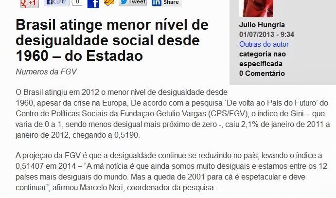 Bom que os manifestantes conheçam números do desenvolvimento social até para exigir que os políticos acelerem a luta contra a desigualdade. Execrar os políticos é compreensível tão ruim é a imagem deles. Mas bom preservar e exigir aprimoramento da política, que é a arma mais democrática do cidadão. A onda de "terra arrasada" não diz respeito à maioria. O enfraquecimento do Estado, tão a gosto dos neoliberais que desapoiaram mas depois passaram a apoiar as manifestações, só interessa à elite política-financeira. Falta aos manifestantes pedir a punição dos corruptores (geralmente grandes grupos) ao lado da condenação de corruptos. Saibam que há projetos no Congresso, engavetados e empoeirados, que agilizariam esse processo. Uma boa consequência da onda de manifestações é a realizaçaõ de debates em universidades, instituições de classe, colégios etc para dar um formato efetivo à difusa voz das ruas. Hora de filtrar o essencial, conhecer os obstáculos, desconfiar do súbito "apoio" da direita, entender porque a mídia começou condenando os protestos e pedindo ação forte da polícia e acabou se engajando com entusiasmo na chamada "revolução do vinagre". Há muito o que entender, aprender e realizar.