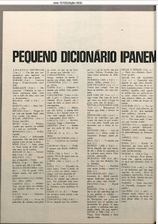 Gírias entregam idades, certo? Mas algumas vencem o tempo e impregnam as falas de várias gerações. Em 1970 Manchete publicou o Pequeno Dicionário Ipanemense da Língua Brasileira. Muitas entre as expressões então reunidas pelo repórter Creston Portilho ainda são adotadas pelas gerações atuais, assim como a turma da bossa nova, do cinema novo, do pier de Ipanema também assimilou locuções de décadas anteriores. O bairro era uma antena repetidora que transmitia comportamentos e falas. (José Esmeraldo Gonçalves)